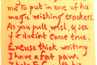 "Papai Noel estava com muita pressa — pediu para mandar junto uma das suas bombas-surpresa mágicas, que realizam desejos. Quando puxarem, façam um…