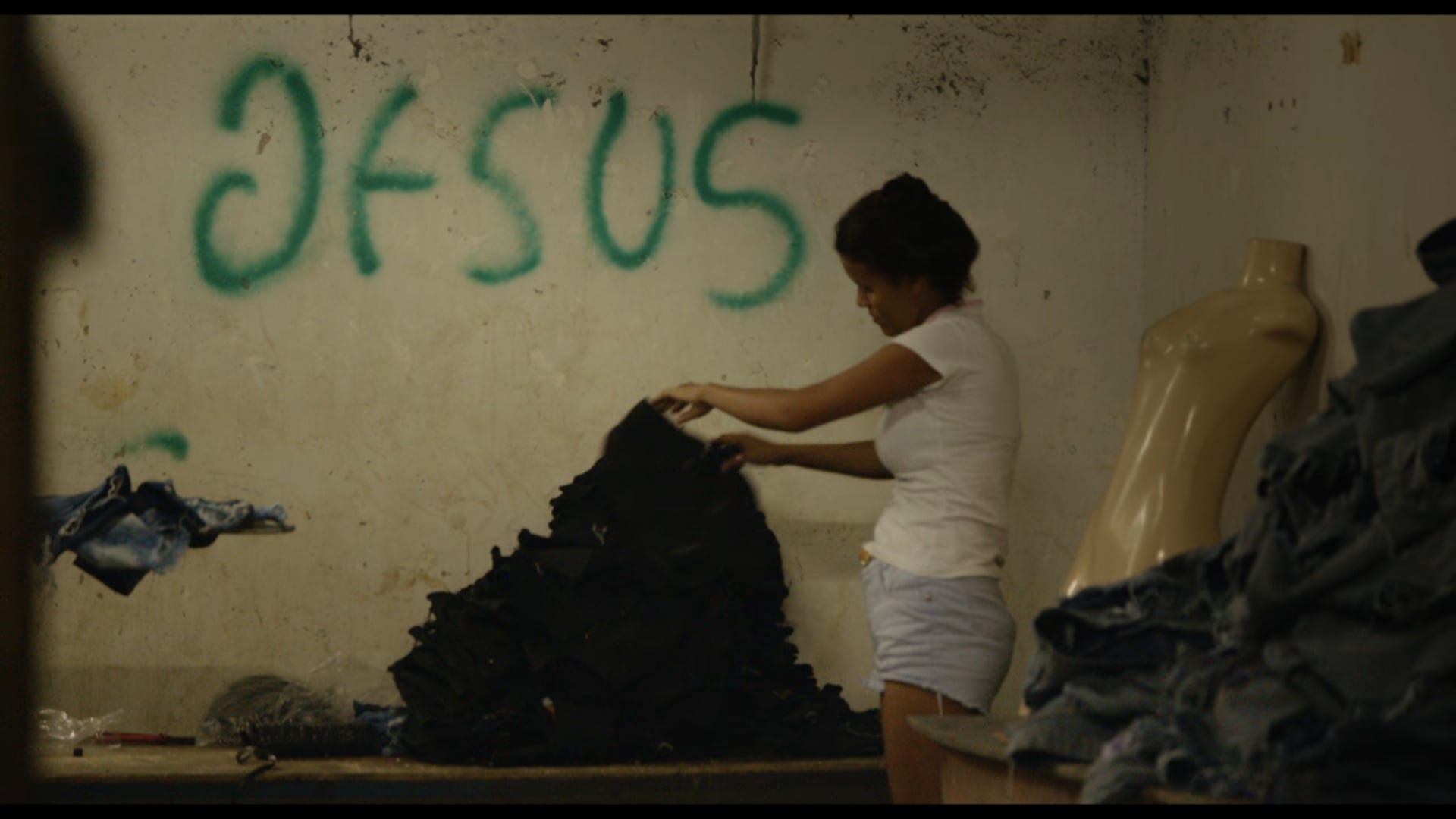 O desespero da jovem Gisele, que às vésperas do Carnaval de 2018 pôs sua geladeira na calçada, à venda, por R$ 200, para poder viajar, sair um pouquinho dali. E depois do Carnaval? Depois do Carnaval a gente trabalha para comprar outra geladeira — e outra TV, e outro fogão e até outra máquina de costurar —, a gente ali do bairro de Gisele, Nova Canaã. E o documentarista lembra que, na Bíblia, Canaã é a “terra prometida”. E em uma facção mostrada no documentário a única cor além do azul do jeans é o verde de um “Jesus” grafitado na parede.