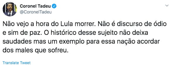 Naquele mesmo novembro de 2019, três anos antes do plano Punhal Verde e Amarelo, Coronel Tadeu postou no Twitter que não via a hora “do Lula morrer”.