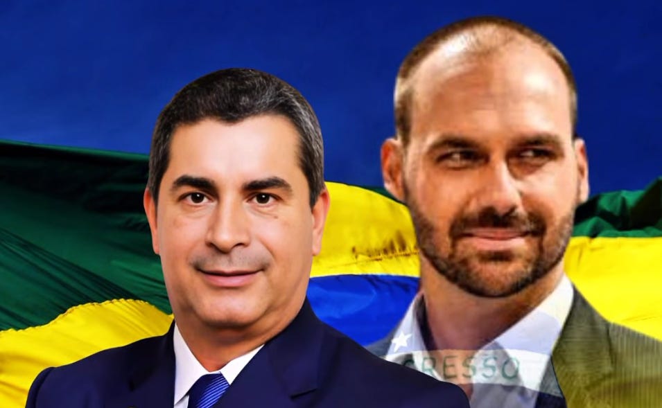 Agora, não é a primeira vez que Coronel Tadeu conjura auxílio externo contra o seu próprio país; não é a primeira vez que faz isso em dobradinha com Eduardo Bolsonaro.