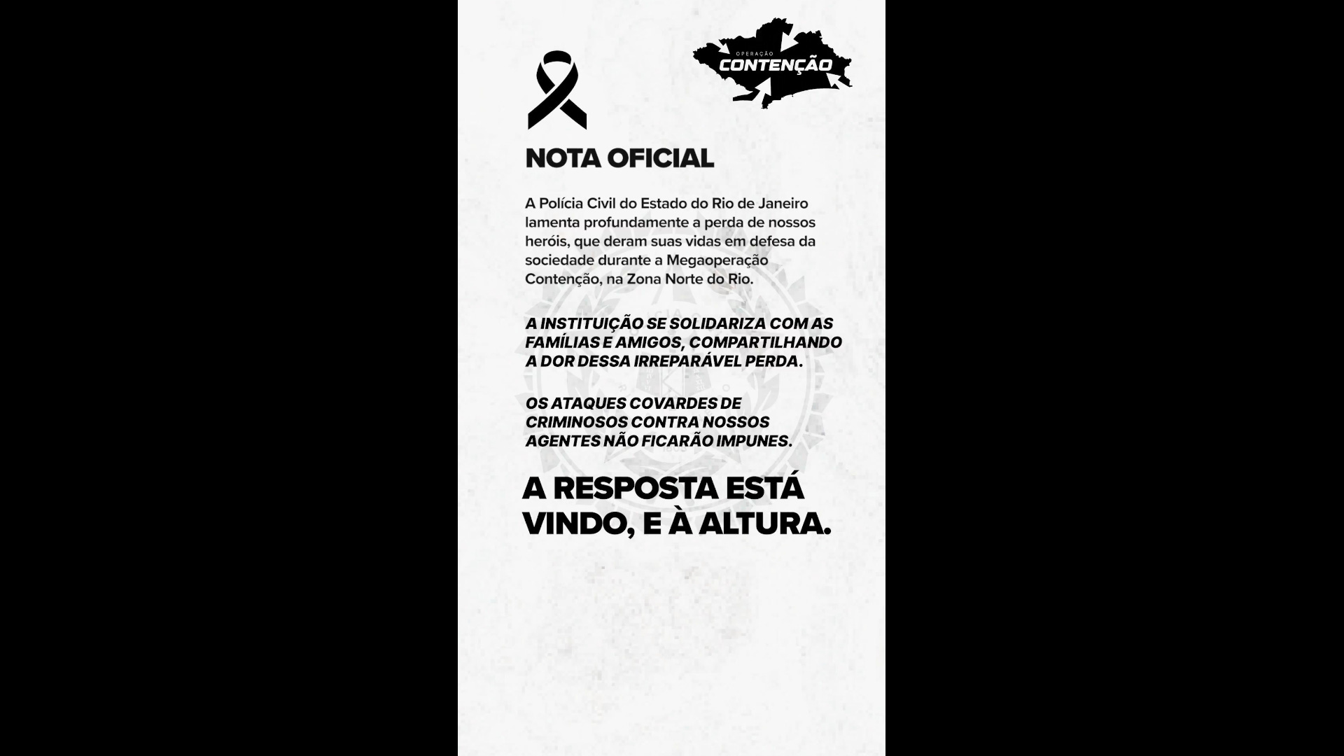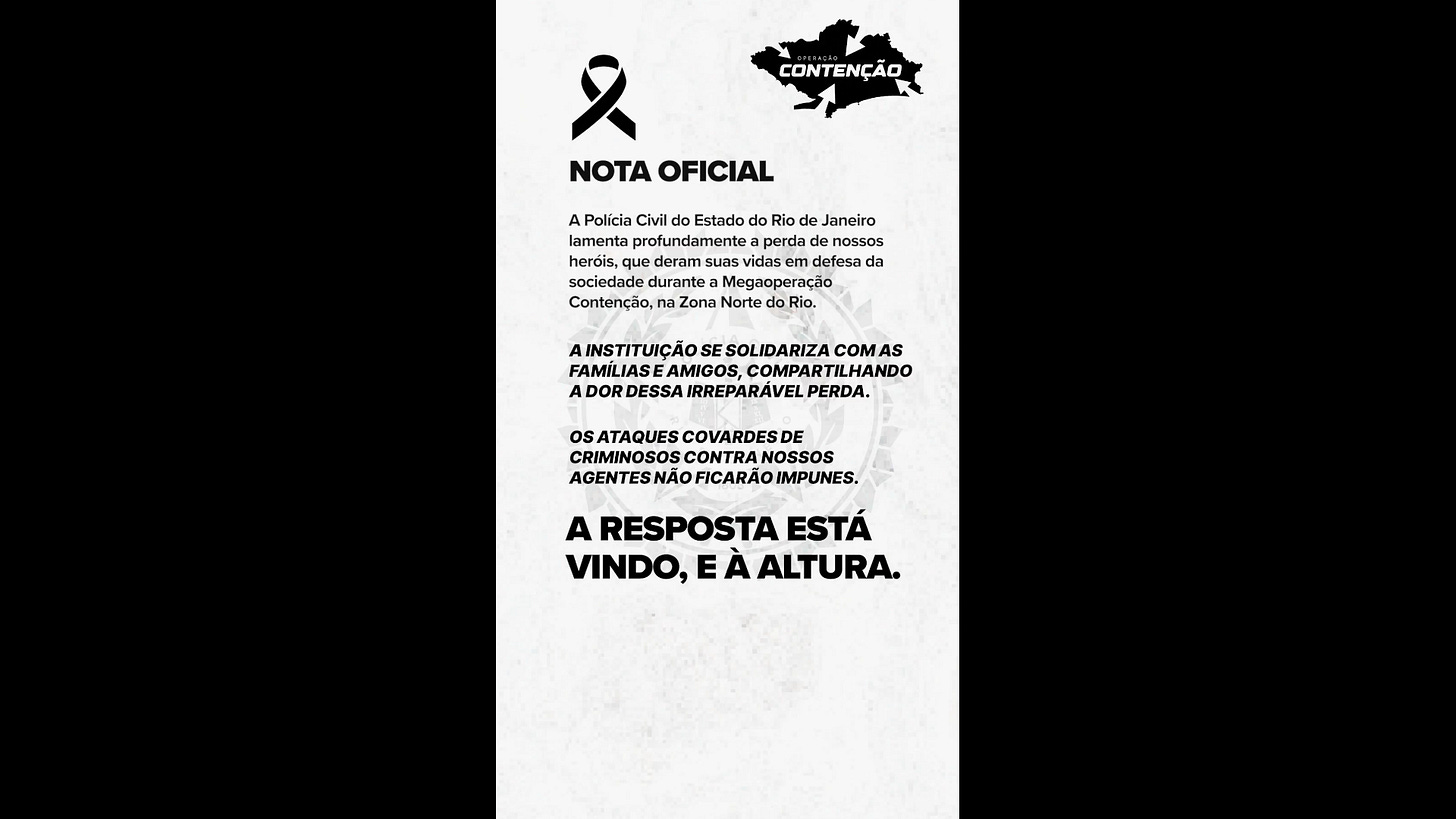 A Polícia Civil do Estado do Rio de Janeiro lamenta profundamente a perda de nossos heróis, que deram suas vidas em defesa da sociedade durante a Megaoperação Contenção, na Zona Norte do Rio.