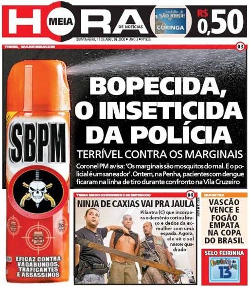 Estávamos no ano em que a cidade sediaria os Jogos Pan-Americanos, o “ano dos três Pês, PAN, PAC e Pau”, no dizer do coronel Marcus Jardim, comandante do 16º Batalhão da PM, responsável pelo policiamento daquela região que ficou três meses sob cerco das polícias civil e militar e da Força Nacional de Segurança. Em outra ocasião, o coronel chamou de “Bopecida” a tropa de elite do Rio, aquela dos homens de preto cuja missão é entrar na favela e deixar corpos no chão. Deve ter achado muito espirituosa essa definição para os exterminadores de bandidos e talvez não tenha reparado no equívoco: pois, se inseticida elimina insetos, o Bopecida eliminaria o Bope... a imprensa popular tampouco notou, ou preferiu ignorar, porque valia mais a pena explorar a imagem engraçadinha do frasco de inseticida que não deixava nenhum marginal de pé.