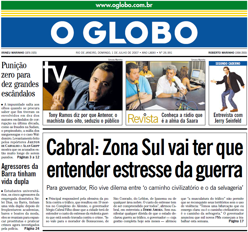 Não só por isso vale a pena reler a reportagem, mas também para lembrar que daquela vez não foram mortas “apenas” 19 pessoas, como é a referência recorrente da imprensa: foram 19 apenas naquele dia, 27 de junho de 2007. Segundo avaliação da Comissão de Direitos Humanos da OAB-RJ na época, teriam sido pelo menos 44 durante o período de três meses da operação.