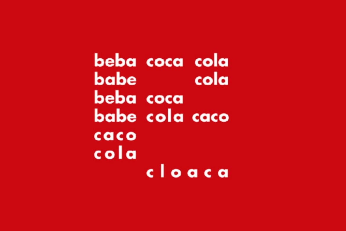 (Coca-Cola, como deveríamos saber, está bem longe de ser álibi. Não só por seus efeitos no organismo, mas pelo seu sentido metafórico de veneno-símbolo do imperialismo, imortalizado neste poema de Décio Pignatari, que o professor Carlos Alberto Shimote Martins destacou no Facebook, com o comentário: “O peixe morre pela boca. E quando coloca o boné do Maga na cabeça):