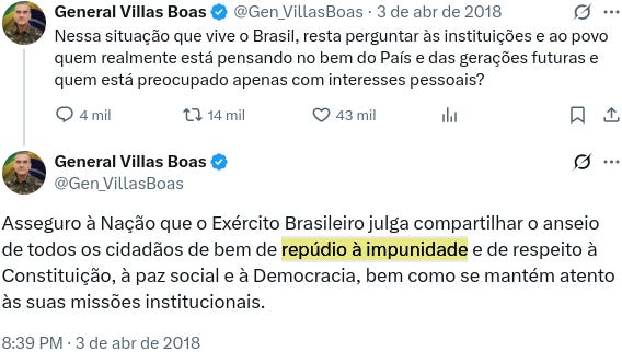 Depois — logo depois —, Tomás Paiva ajudou o necromante do golpismo de coturno no Brasil, general Eduardo Villas Bôas, a ameaçar publicamente o Supremo Tribunal Federal horas antes do julgamento do Habeas Corpus que poderia ter colocado Lula frente a frente com Bolsonaro nas urnas ainda em 2018, em vez de só em 2022. É da lavra de Tomás Paiva, saudado pela mídia corporativa como “general legalista”, o termo-chave daquela ameaça ao Judiciário, daquele famoso tuíte golpista do general Villas Bôas: “repúdio à impunidade”.