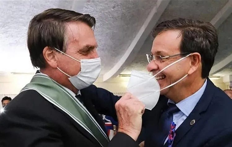 No meio da pandemia, num Dia do Exército, quando o Exército Brasileiro deu uma medalha a Gilson Machado, Bolsonaro, em nova zombaria, tirou a máscara do seu ministro do Turismo quando vestiu a honraria em seu pescoço.