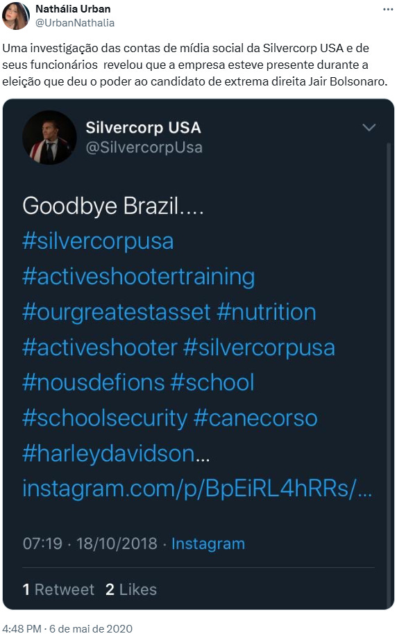 Em 2018, a Silvercorp fez a segurança de um comício de Donald Trump em Charlotte, na Carolina do Norte, e esteve no Brasil durante as eleições que levaram Jair Bolsonaro ao Palácio do Planalto. Quem revelou a presença da empresa de “segurança privada” de Jordan Goudreau no Brasil naquele ano, naquele período, fazendo sabe-se lá o quê, foi a jornalista Nathália Urban. Nathalia morreu no ano passado, aos 36 anos de idade, após cair de uma ponte em Edimburgo, na Escócia, em circunstâncias que nada têm a ver com este caso.