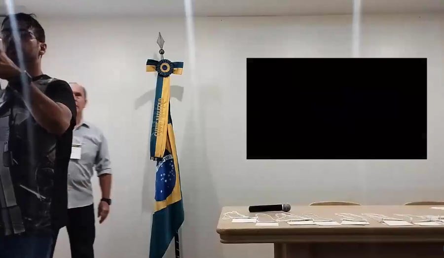 Após agradecer a presença de Sebastião Coelho, Caçadini apontou para a bandeira do Brasil e disse: “essa bandeira aqui, ela não merece ser vermelha”. De microfone em punho, o desembargador aposentado disse que o STF “tomou as atribuições do Poder Executivo e as atribuições do Congresso Nacional”.