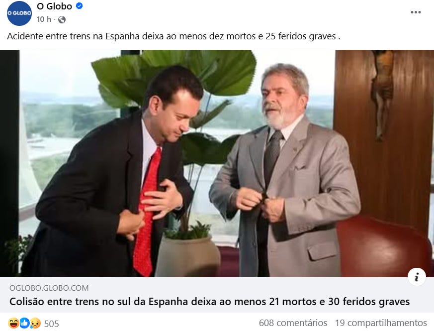 “Colisão entre trens no sul da Espanha deixa ao menos 21 mortos e 30 feridos graves”, diz o título da matéria do Globo sobre a tragédia ocorrida na noite deste domingo, 18 de janeiro, perto de Córdoba. A foto que ilustra o texto, destacada na página do jornal no Facebook, é de Lula com Gilberto Kassab, na sala do presidente, no Palácio do Planalto.