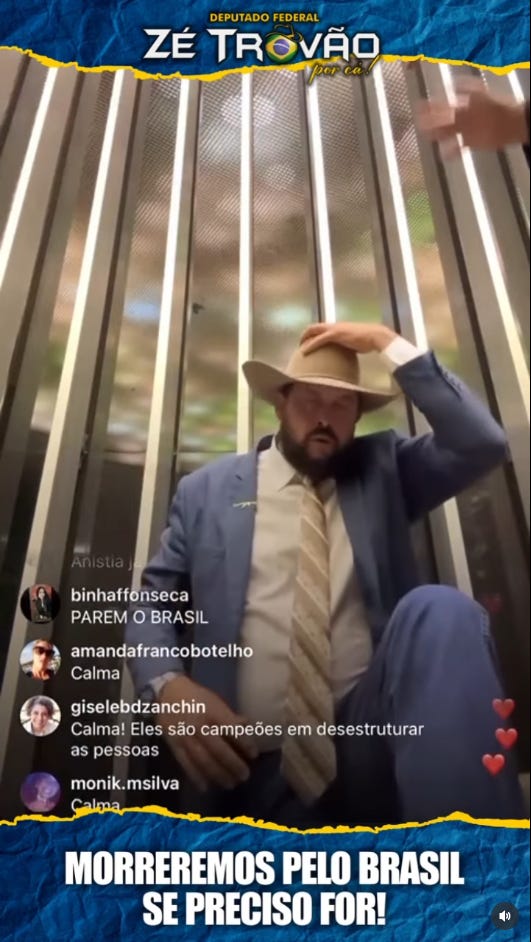 Antes disso tudo, Zezinho, o deputado Zé Trovão (PL-SC), posicionou-se no meio da pequena escada que dá acesso à Mesa da Câmara. Vestindo chapéu de caubói e usando um broche de fuzil, encostou-se na parede e esticou a perna de modo a impedir a passagem de não autorizados: “aqui ninguém passa. Eu derrubo boi de 400 quilos”. Transmitindo ao vivo no Instagram, o leão de chácara de golpe apontou os líderes dos invasores e trovejou: