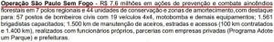 O primeiro documento informa que em 2023 o estado de São Paulo executou R$ 7,6 milhões em ações de prevenção e combate a incêndios florestais, entre elas a manutenção de 1.500 quilômetros de estradas e aceiros, que são as áreas em volta de propriedades e matas que devem ser mantidas limpas para impedir a propagação do fogo.